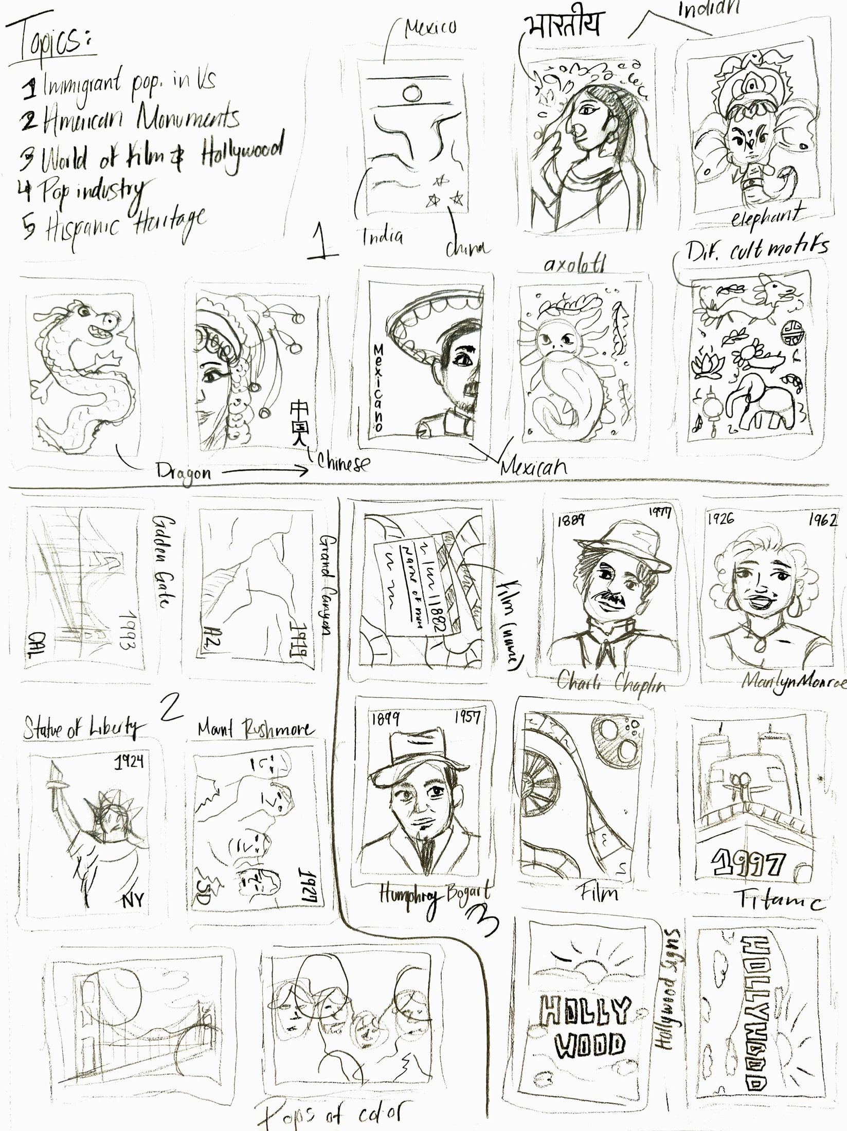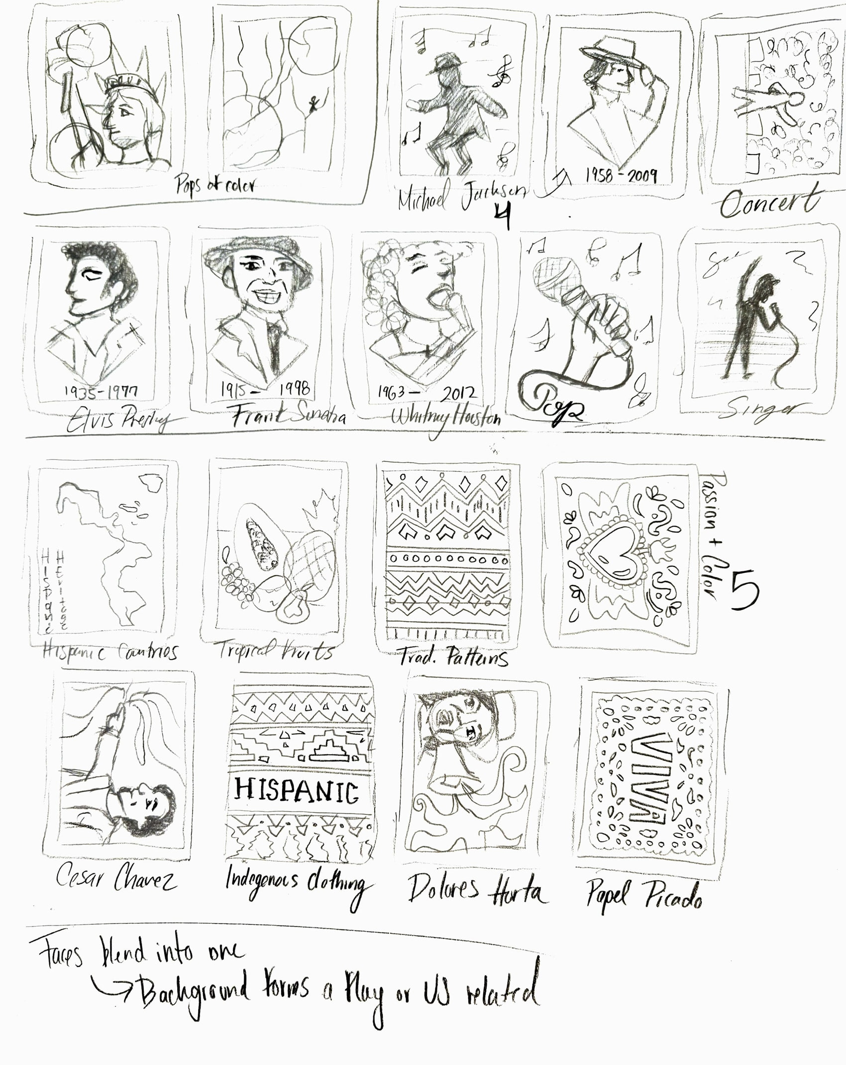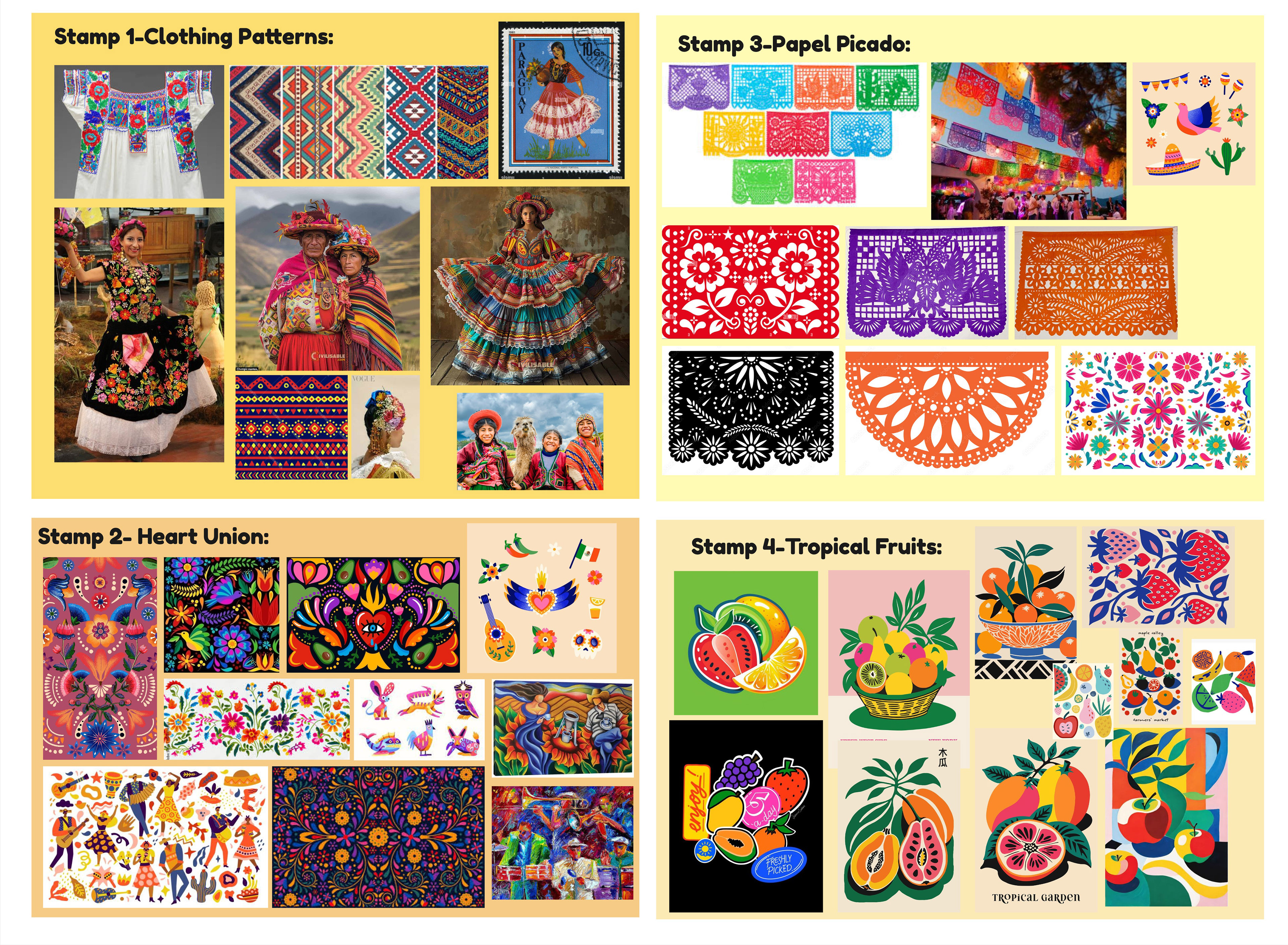 I selected four distinct areas within my chosen topic of celebrating Hispanic heritage, ensuring each stamp conveyed a unique aspect of this rich cultural narrative.