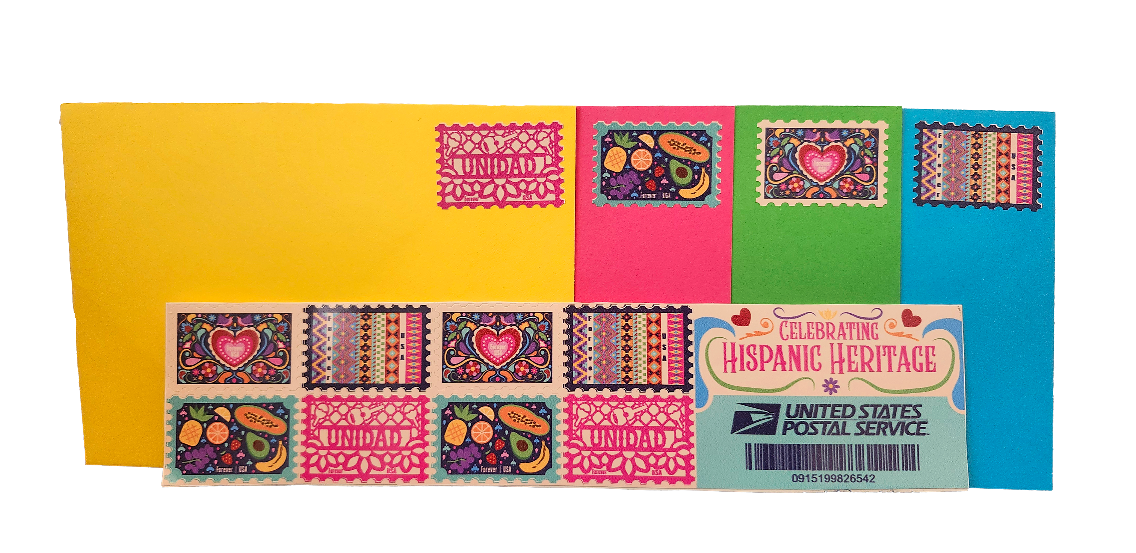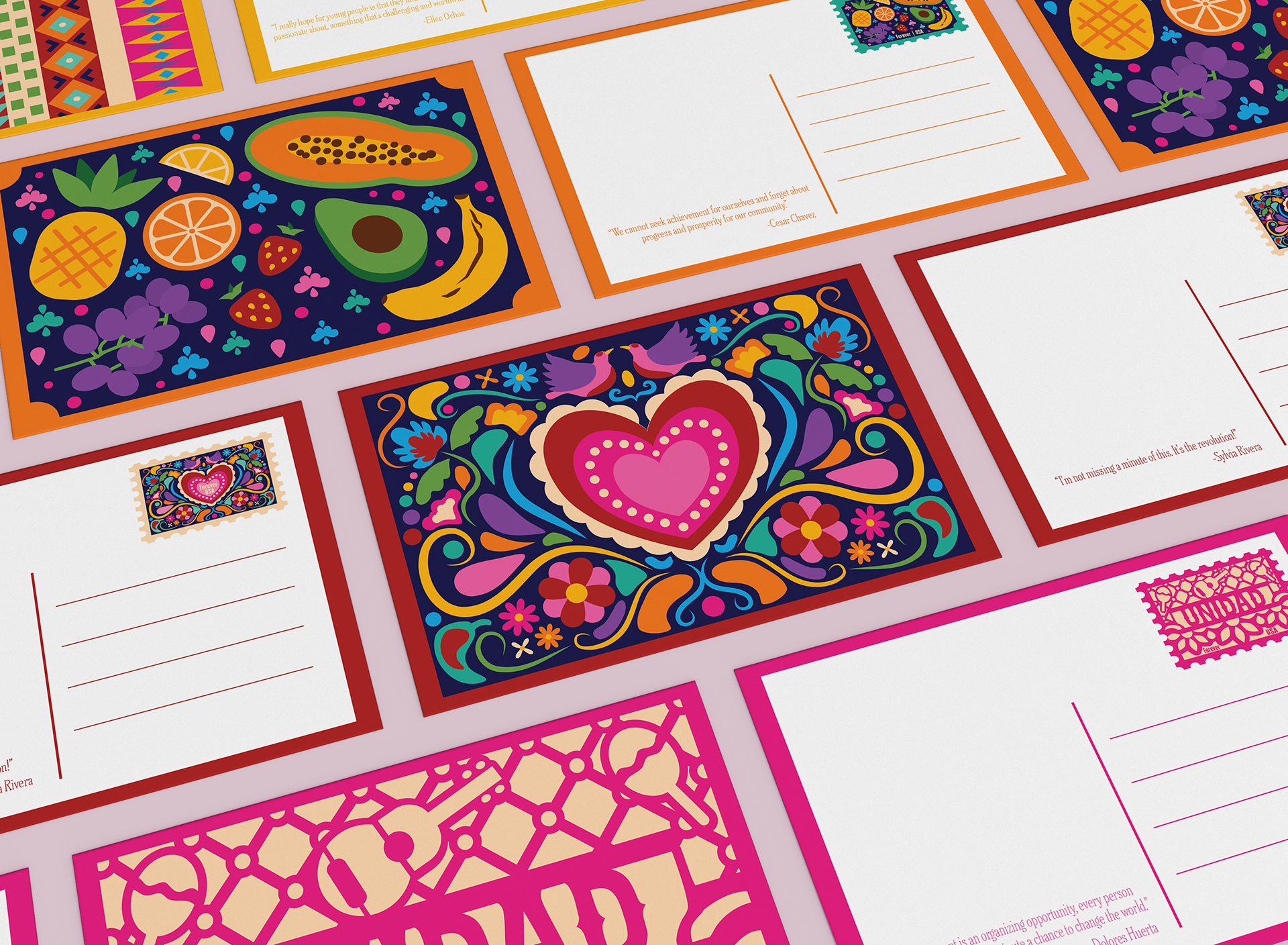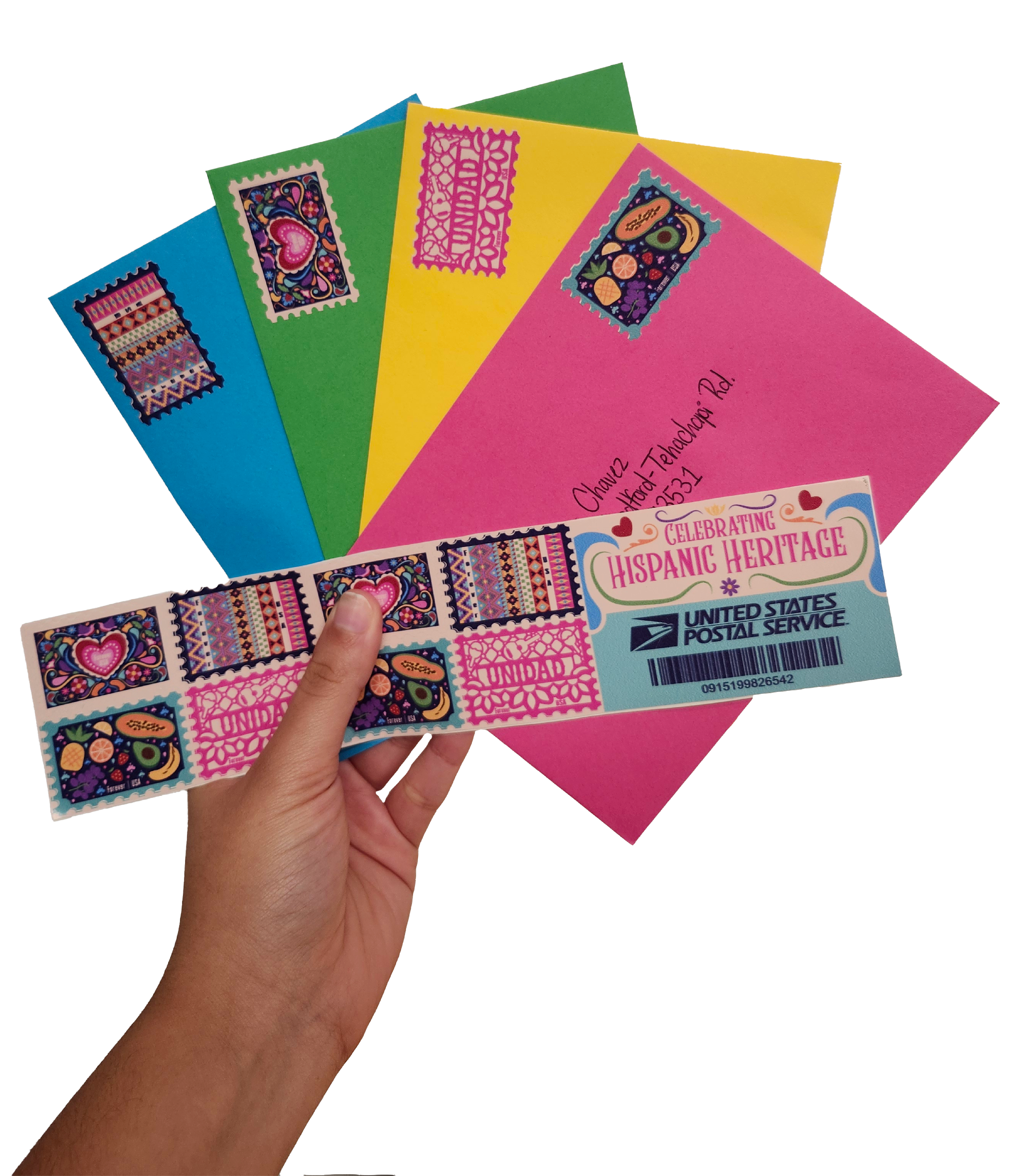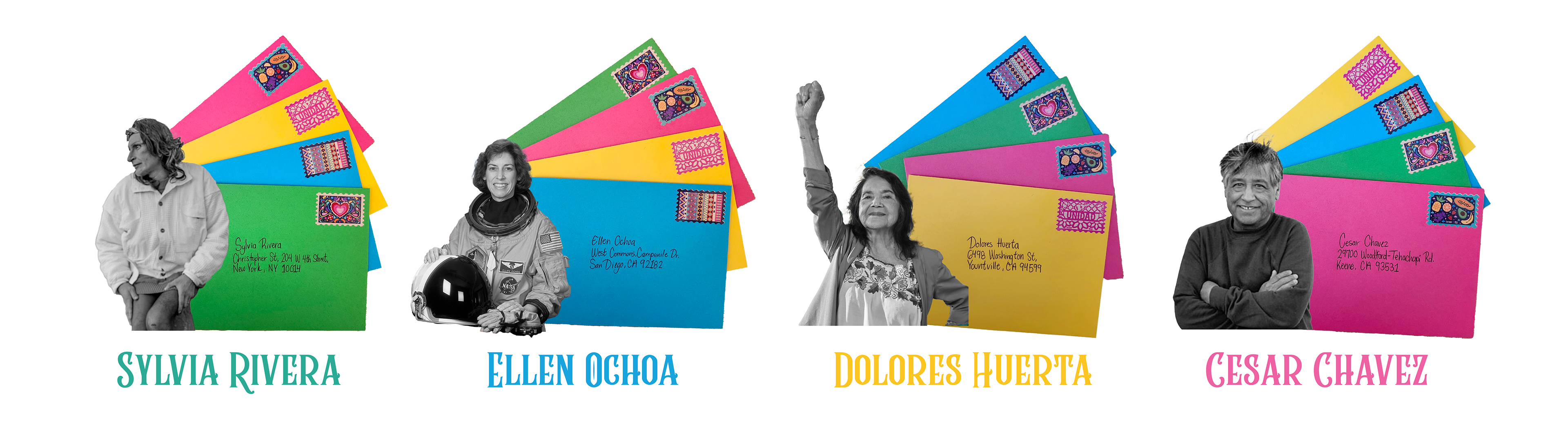 The names on each envelope represent significant Hispanic figures who have contributed to the prosperity of the Hispanic community in the U.S. The addresses correspond to landmarks, monuments, or locations that celebrate and highlight the importance of each individual.