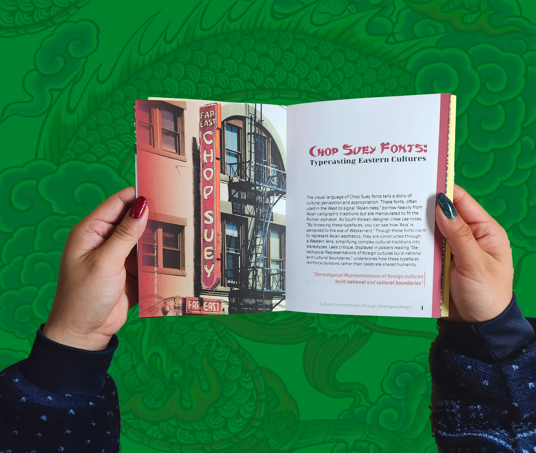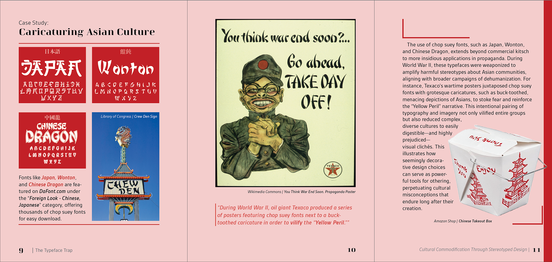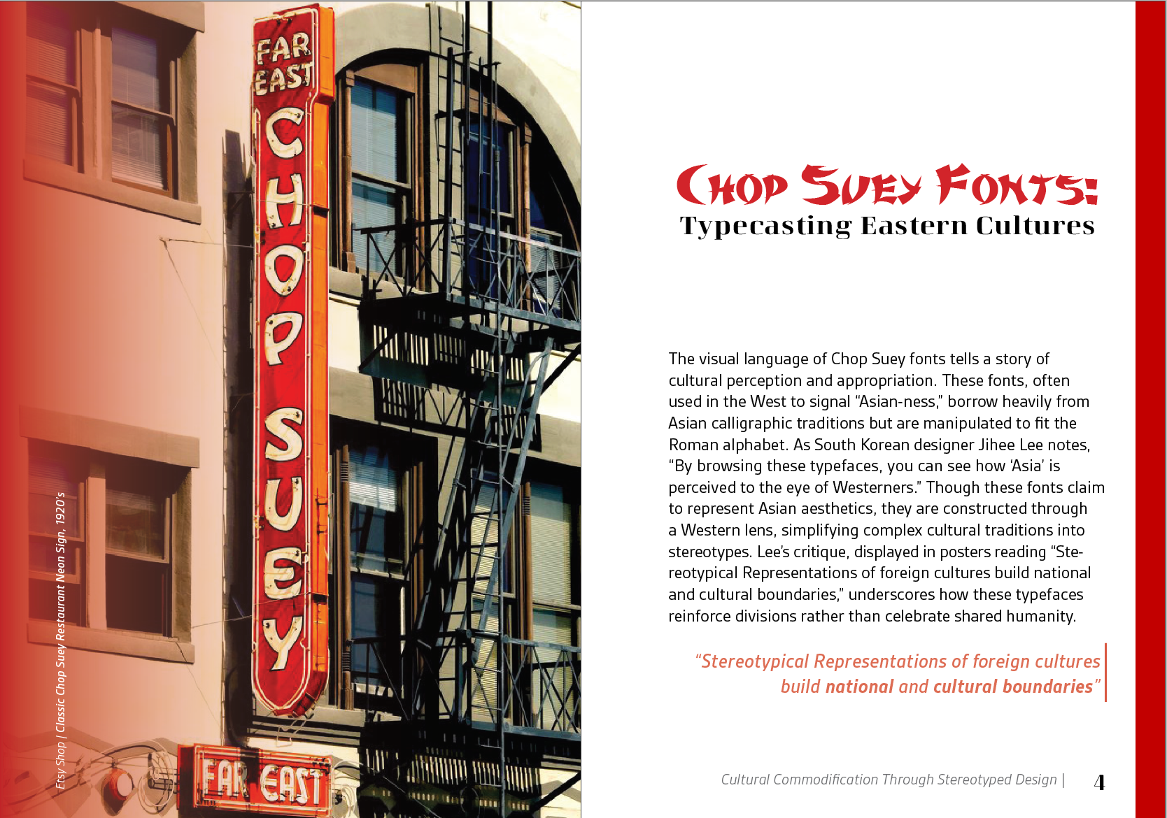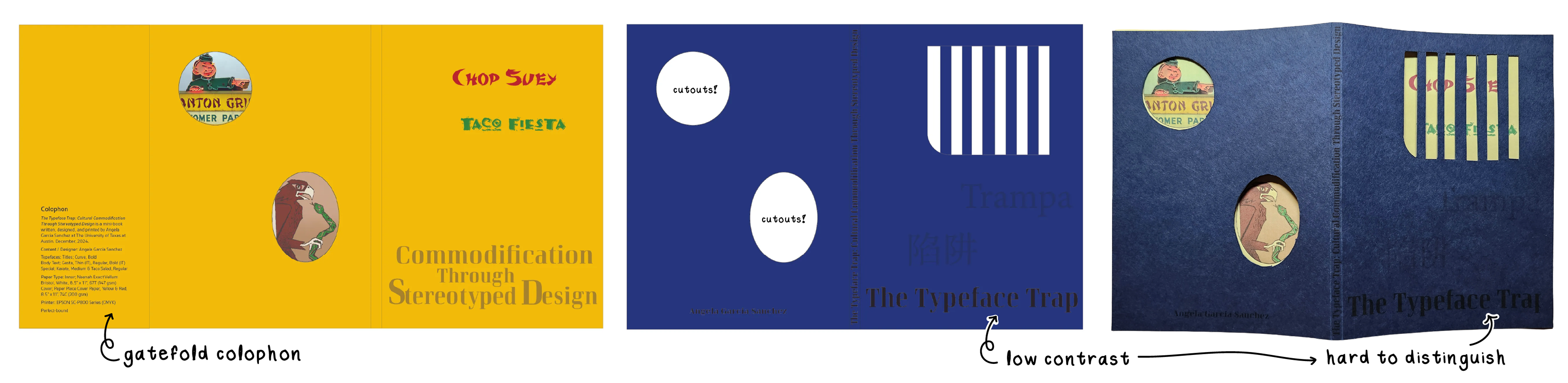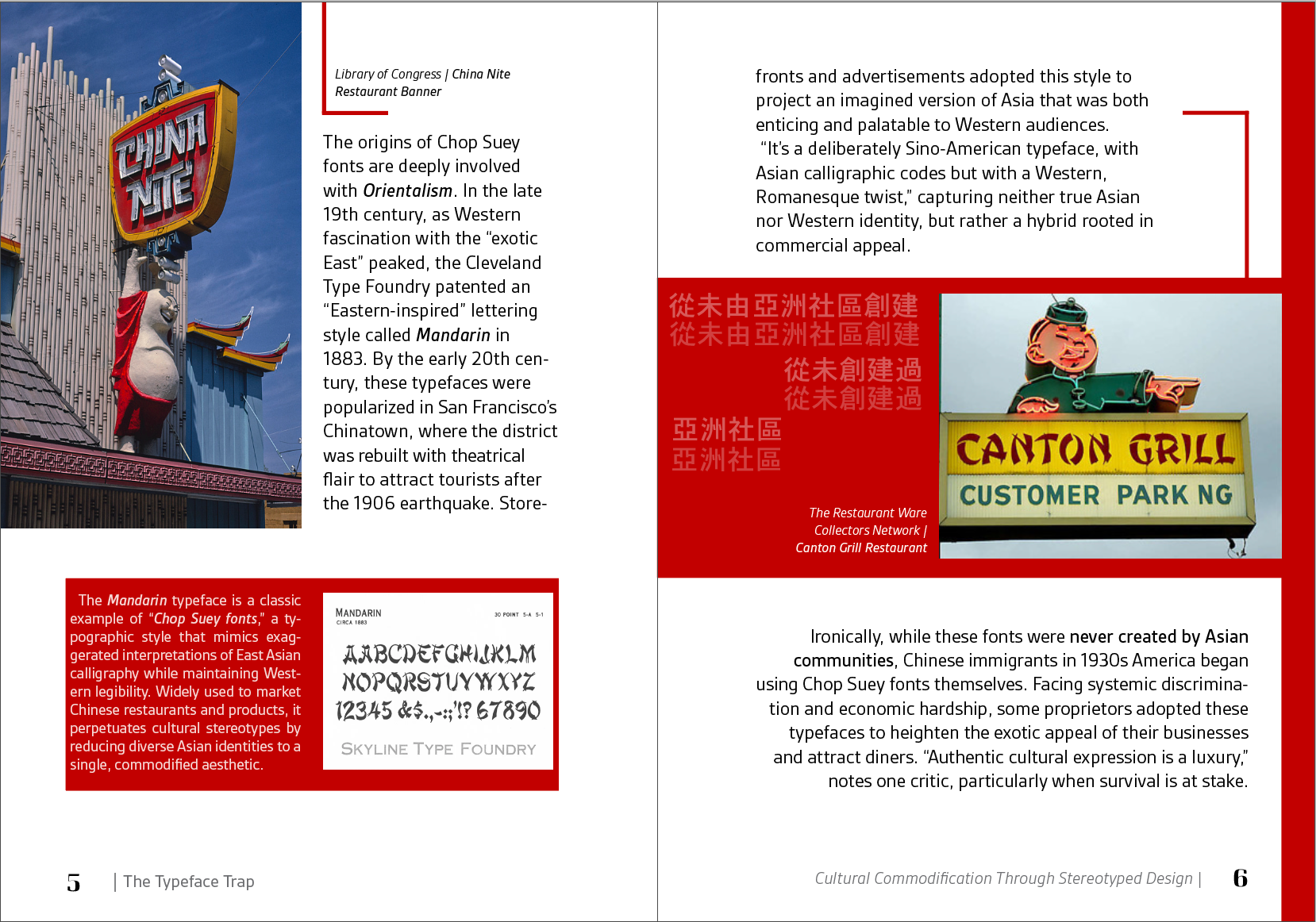 Selecting the book’s title was an intentional process, as I wanted it to reflect both the theme and its critical stance on typography’s role in cultural representation. I ultimately chose The Typeface Trap: Cultural Commodification Through Stereotyped Design because it captures the tension between stereotype and authenticity while clearly conveying the core focus of my research.