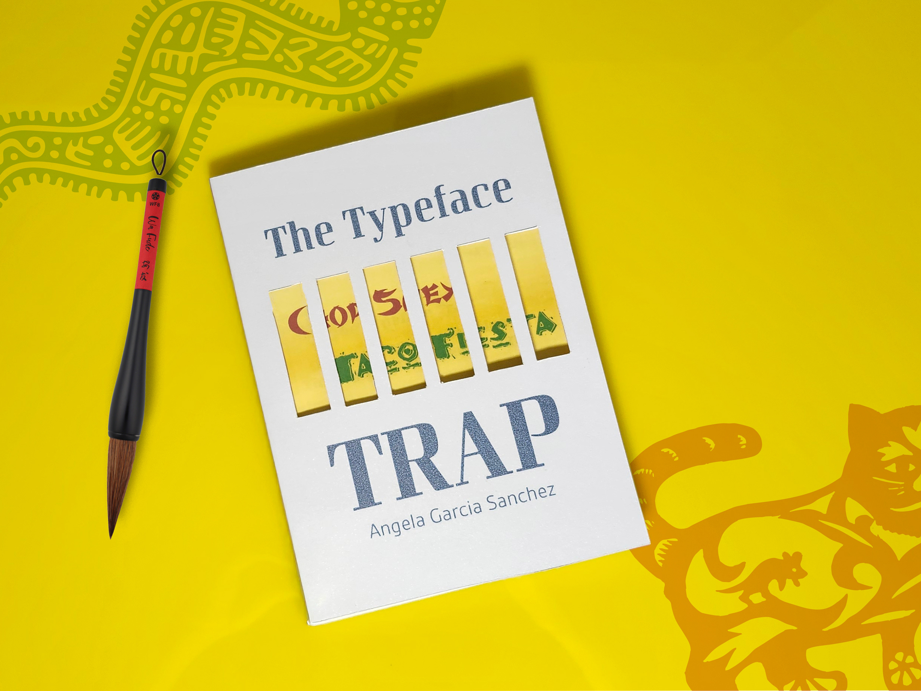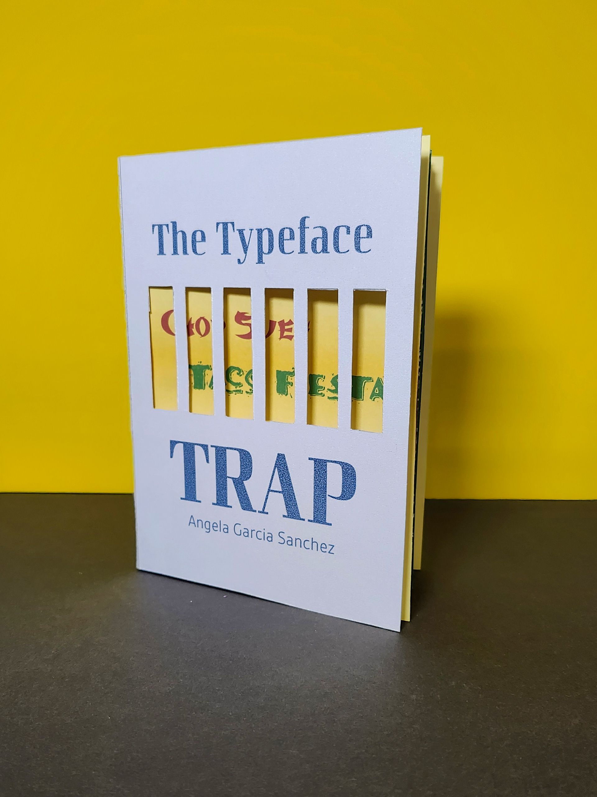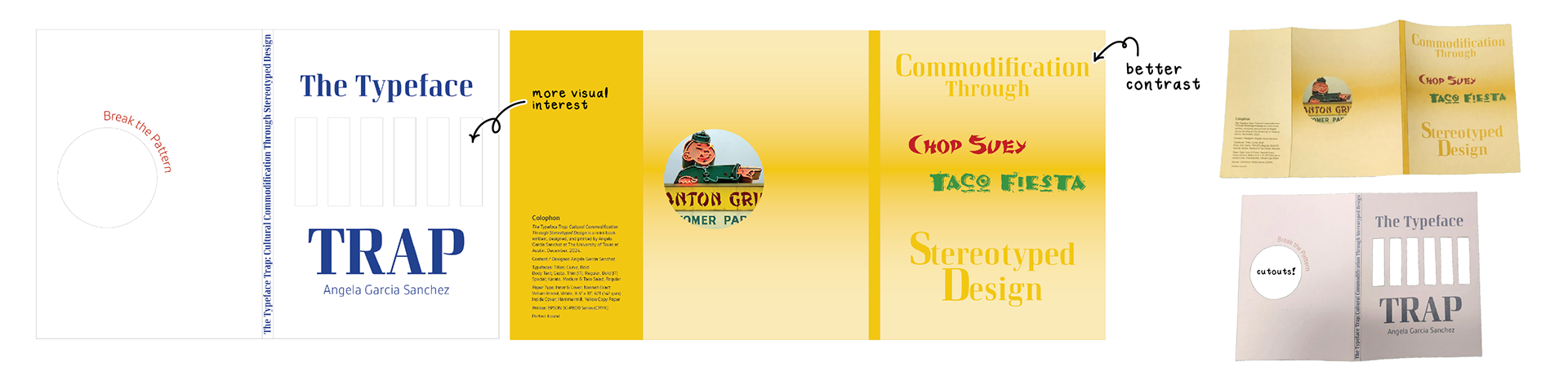 I initially struggled with how to visually “sell” the book’s narrative, but the word Trap in the title inspired a conceptual direction. I developed a jail-cell metaphor, using die-cut bars to symbolize how stereotypical fonts confine cultural identities, reinforcing the book’s critique of commodified representation. A subtle “Break the Pattern” message on the back further echoes this call to challenge design conventions.